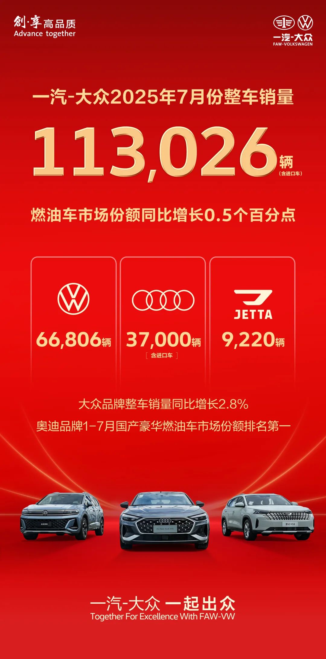 8月1日,一汽-大众发布7月份销售业绩,实现整车销售113,026辆(含进口车),燃油车市场份额同比提升0.5个百分点。其中,大众品牌销售66,806辆,销量同比增长2.8%;奥迪品牌销售37,000辆(含进口车),1-7月国产豪华燃油车市场份额排名第一;捷达品牌销售9,220辆。作为下半年开局的强劲表现,一汽-大众通过智造升级、商品焕新、品质安全夯实三位一体的体系实力,持续回应客户对高品质出行的信赖与期待。