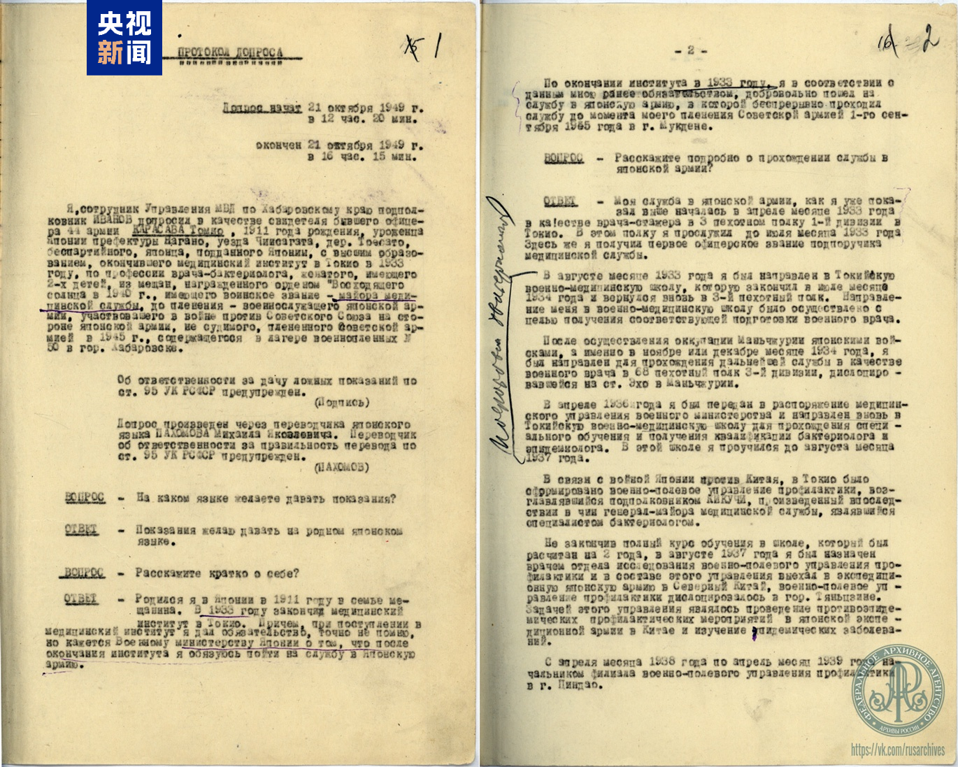 俄罗斯联邦档案署当地时间8月25日在社交平台发表文章,披露了对侵华日军第七三一部队(简称731部队)第四部生产分部长、军医少佐柄泽十三夫的书面证词。这份证词如今保存在俄罗斯国家军事档案馆。
